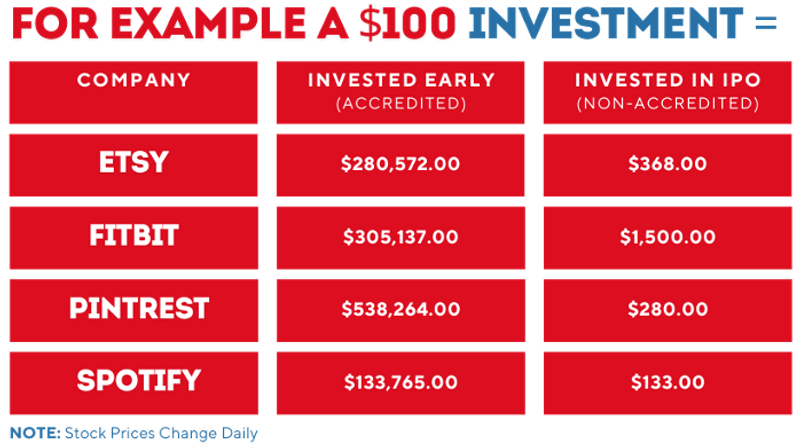 For example: If you were an accredited investor and invested $100 in Twitter when it was just starting out, that $100 investment grew to $159,627.00, between 2006 to 2013. However, non-accredited investors, (most of America) had to wait until the company was public in to invest. If you invested $100 after Twitter went public in 2013 to today, your stock would have an estimated value of under $300 bucks. There are hundreds of companies with this kind of growth from private to public, not just one or two like we are led to believe. And there are thousands that grow $100 to $10,000. We want to give everyone the same chance the wealthy have had. But remember, even the wealthy can lose all their investment capital. So invest wisely.